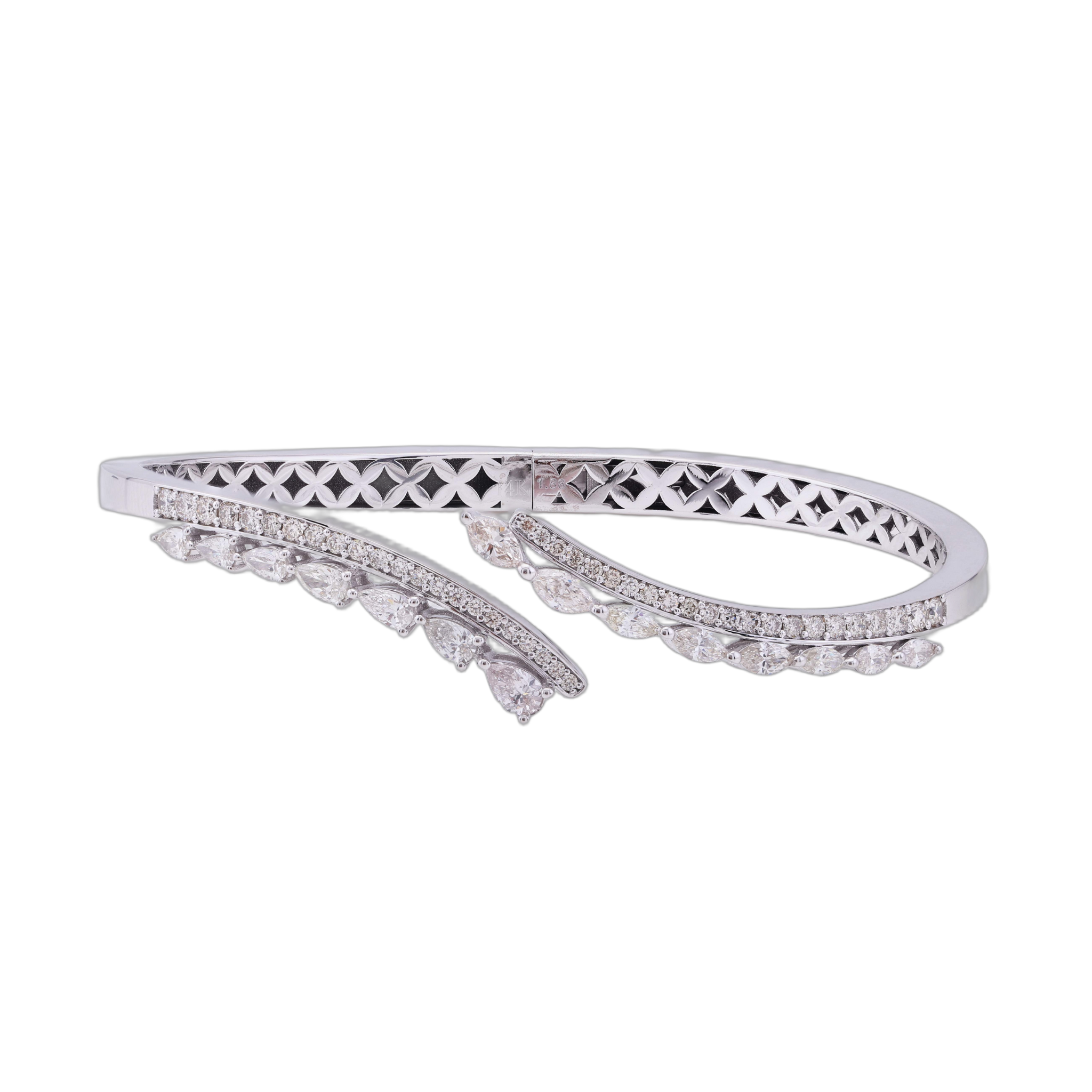 SKU NO – BL-01765 CATEGORY – BANGLE SUB CATEGORY – BANGLE GENDER – Female COLLECTION – DESIRE GOLD KT – G14KT GOLD COLOR – W PRODUCT SIZE – GROSS WEIGHT – 12 GOLD WEIGHT – 11.628 DIAMOND WEIGHT – 1.86 QUANTITY – 1