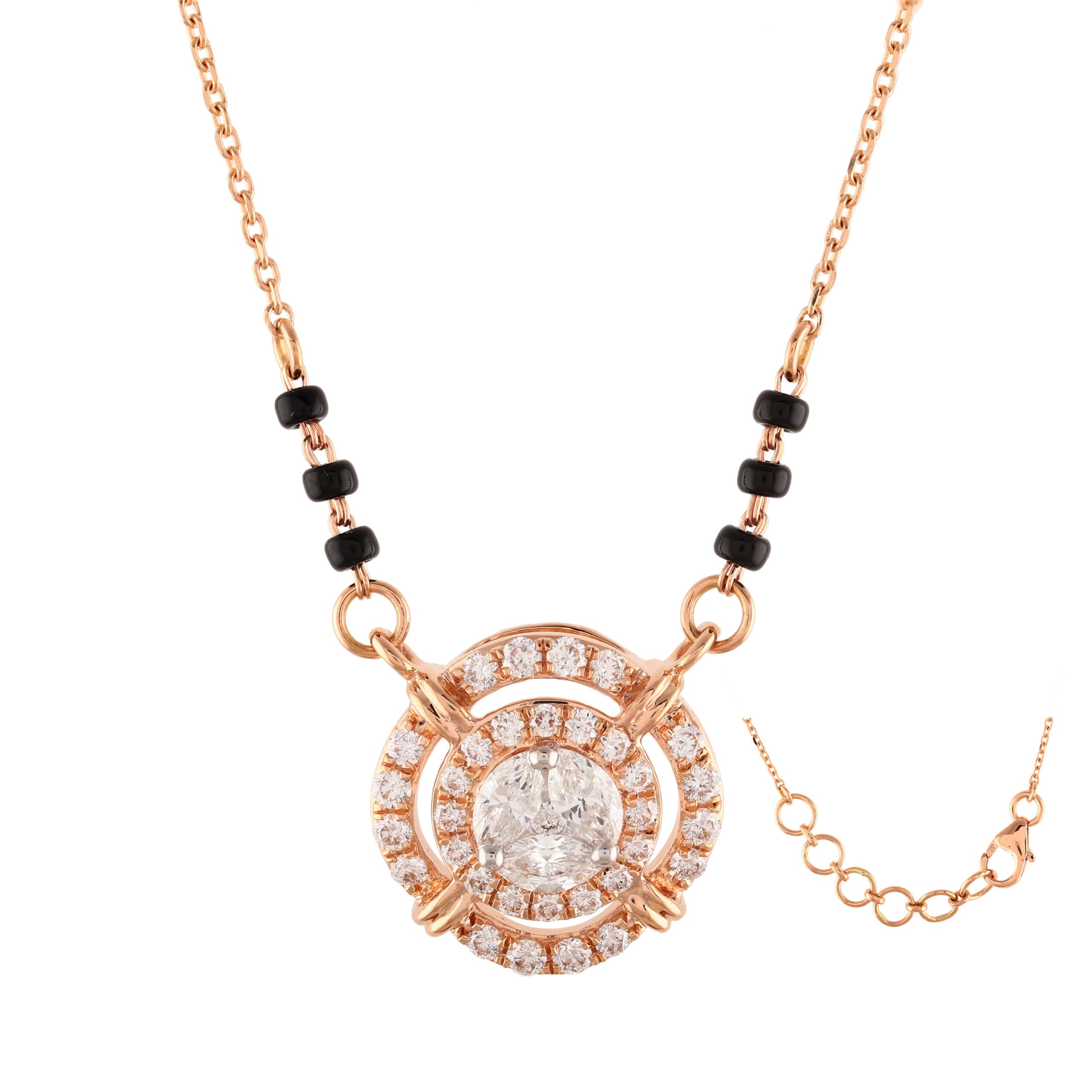 SKU NO – MP-00285 CATEGORY – MANGALSUTRA SUB CATEGORY – MANGALSUTRA GENDER – Female COLLECTION – DESIRE GOLD KT – G14KT GOLD COLOR – P PRODUCT SIZE – GROSS WEIGHT – 4.953 GOLD WEIGHT – 4.791 DIAMOND WEIGHT – 0.810 QUANTITY – 1