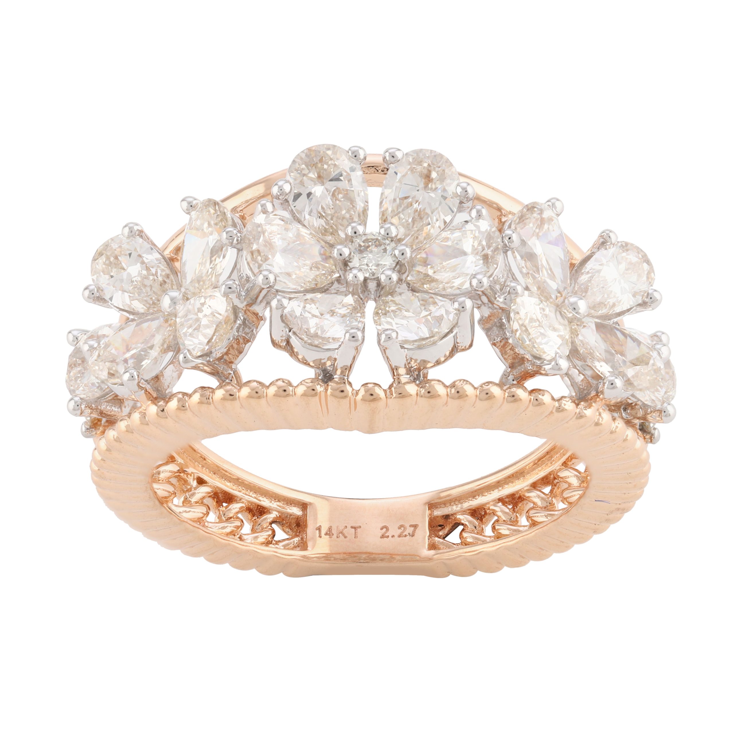 SKU NO – RP-21233 CATEGORY – RING SUB CATEGORY – RING GENDER – Female COLLECTION – DESIRE GOLD KT – G14KT GOLD COLOR – P PRODUCT SIZE – GROSS WEIGHT – 4.725 GOLD WEIGHT – 4.271 DIAMOND WEIGHT – 2.270 QUANTITY – 1